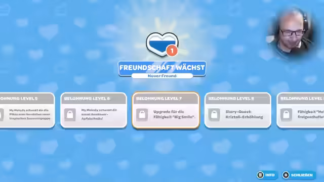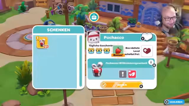 03:29:18Nach Abschluss der Schirm-Quest erhält der Streamer als Belohnung einen Apfelkuchen von Hello Kitty und steigt in die Freundschaftsstufe 2 auf. Er erkundet die Freundschaftsmechaniken und entdeckt, dass man durch Geschenke wie fruchtige Kuchen die Freundschaft schneller aufbauen kann. Er freundet sich mit Batsmaru an, dessen Fähigkeit „Fischflüsterer“ das Angeln verbessert. Des Weiteren lernt er ChocoCat kennen, der als Forscher auf der Insel unterwegs ist und eine Werkbank zur Verfügung stellt, und er beginnt die Quest zur Rettung der verschwundenen Freunde mit dem Bau eines Energiekristallsensors.