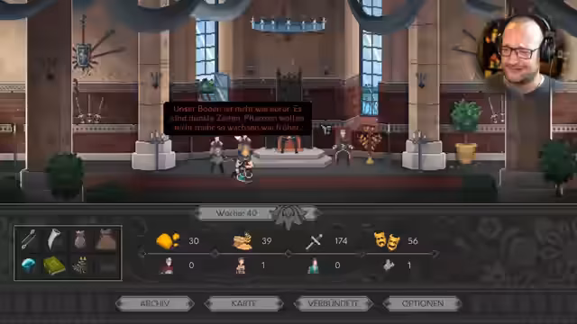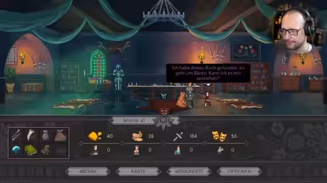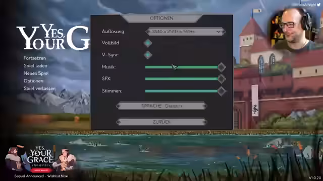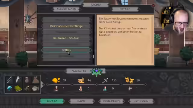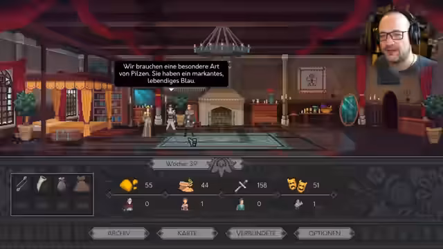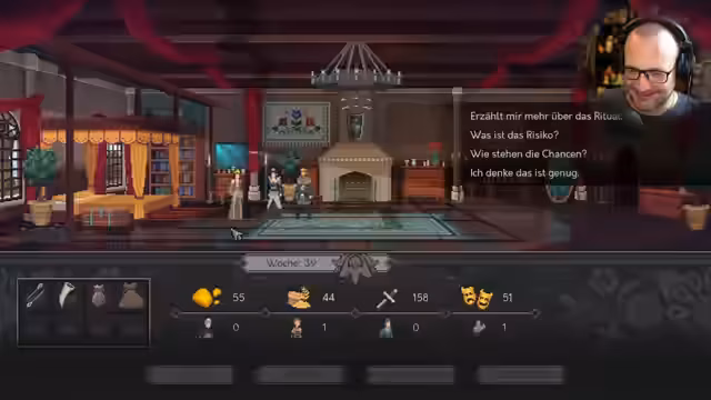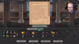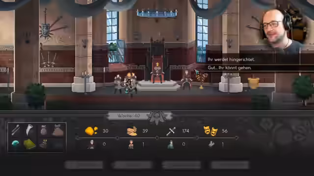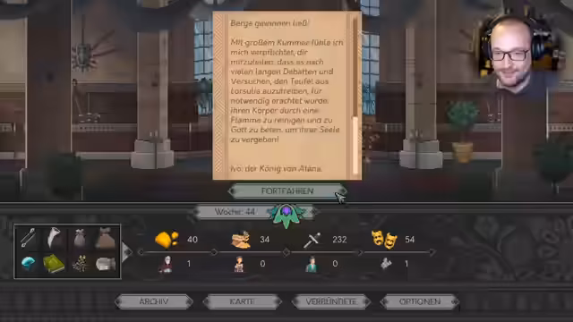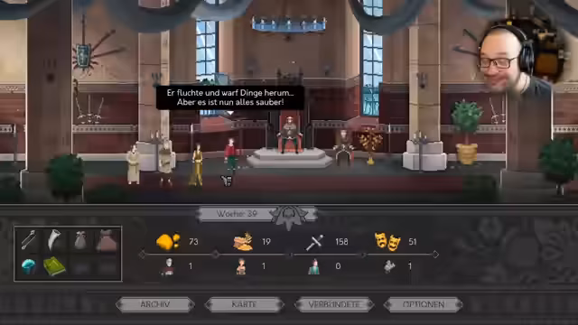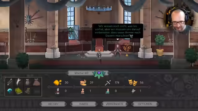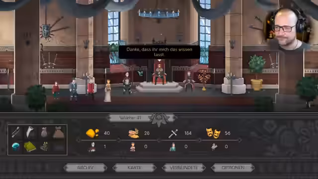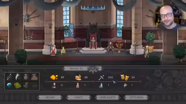 01:23:27Der Stream begrüßt die Zuschauer zum Finale von Yes, Your Grace. Nachdem ein wichtiges Achievement erreicht wurde – der Verkauf aller Bilder – startet der Kommentar zur Handlung. Die Spannung steigt, da noch 14 Wochen bis zur Belagerung durch den Feind bleiben. In zehn Wochen soll das Kind geboren werden. Der König plant, die Bevölkerung unglücklich zu machen, um Geld für die Verteidigung zu sparen, und behält die Hexe sowie den General für spezielle Aufgaben.