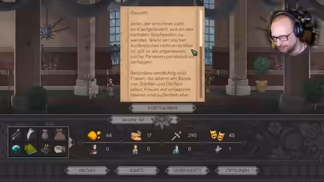 01:46:20Die Suche nach den Ritualzutaten beginnt. Der Streamer findet hellblaue Pilze im Kerzer, das Zauberbuch „Anwendung von Ritualen, Flüchen und Heilungen“ sowie eine Roteute. Für die anderen fehlenden Zutaten wie Weinraute und Basilisken-Eier werden Agenten geschickt. Nebenbei werden Vorbereitungen für den bevorstehenden Krieg getroffen, das Tor verstärkt und ein Graben gebaut, um die Festung zu schützen. Ein Handel mit einem Dorf über ein neues Kolovrat scheitert.