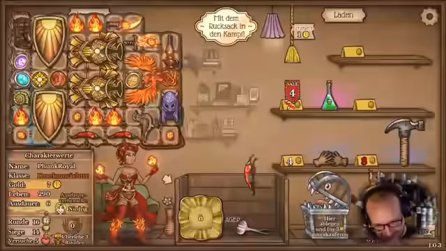 02:09:59Nach dem Sieg wird der Rucksack für den nächsten Kampf optimiert. Unnötige Gegenstände werden verkauft und Platz für neue Items wie ein Amulett geschaffen. Die Strategie für den nächsten Gegner, einen Schneemeister, wird angedacht, der Frost verursacht, dessen Effekt aber umgewandelt werden kann, um den eigenen Charakter zu stärken.