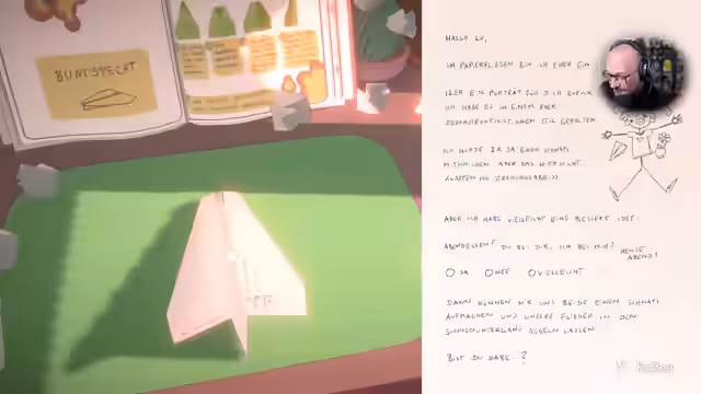 03:12:00Der Fokus verlagert sich auf das interaktive Spiel 'Tic-Tac-Tombiel', in dem Papierflieger gefaltet und geworfen werden. Kolja versucht, einen Flieger in den Westen zu schicken. Dies führt zu einer komödiantischen Interaktion mit einer Figur namens Erich. Das Spiel löst beim Streamer Erinnerungen an seine eigene Jugend an Flaschenpostbriefe aus und fördert eine Verbindung zu den Zuschauern.