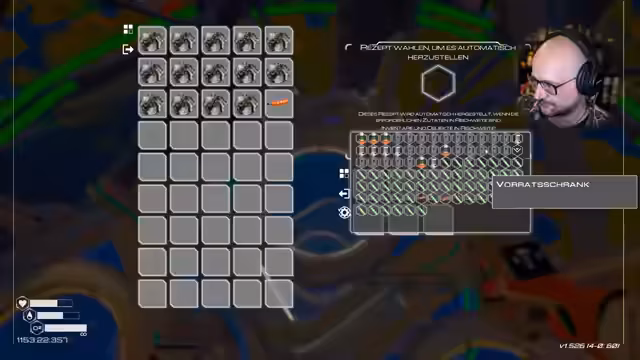 05:01:11Der Fokus liegt auf der Automatisierung durch Drohnen. Nach der Fertigstellung von Vorratsschränken und Produktionslinien wird ein Drohnen-Upgrade auf Stufe 2 in Betracht gezogen. Nach einer Diskussion über Geschwindigkeitsvorteile wird entschieden, dass das Upgrade nicht notwendig ist, da die Drohnen bereits ausgelastet sind und keine Engpässe bestehen. Stattdessen plant der Streamer, Schwefel-Extraktoren zu bauen, um die Produktion weiter zu optimieren und die automatisierte Logistik zu verbessern.