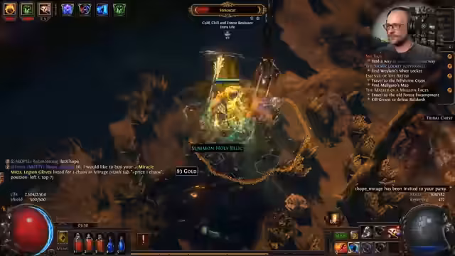 09:04:10Während des Streams treten mehrere technische und spielinterne Hindernisse auf. So wird über ein Problem mit den Drops auf der Webseite gesprochen und eine manuelle Aktualisierung per STRG+F5 vorgeschlagen. Auch im Spiel selbst gibt es Schwierigkeiten, als der Guardian aufgrund von Mana-Problemen durch Clarity nicht mehr teleportieren kann, was zur Anpassung des Builds führt.