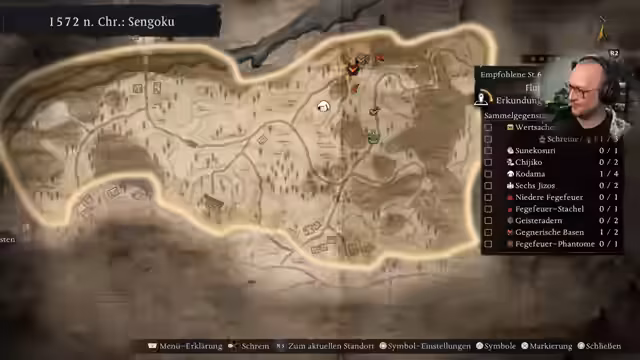 04:59:13Ein Setbonus der 'blutroten Armee' wird gefunden. Das neue System zum Anpassen von Kampfkünsten wird gezeigt, das individuelle Kommandos erlaubt. Drei Haltungen (hoch, mittel, tief) beeinflussen die Angriffe und Verfügbarkeit von Fähigkeiten. Die Erkundung der Welt wird mit dem Kompass erleichtert, der Schreine und Gräber anzeigt. Interaktion mit freundlichen Yokai kann die Anzahl der Elixiere erhöhen.