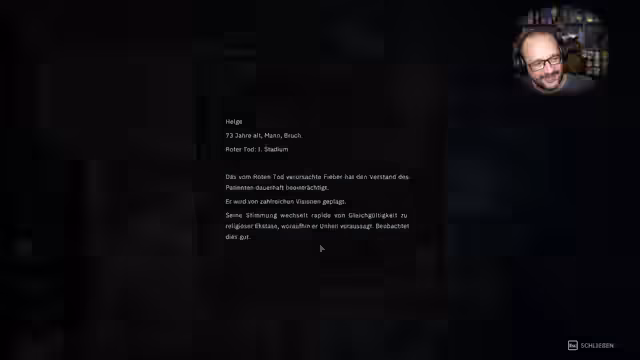 07:43:09Der Streamer findet Leichen und entdeckt grausame Geheimnisse über das 'Spital' und die Forschung am 'Roten Tod'. Er liest Autopsieberichte und Notizen über Experimente an Patienten, einschließlich einer schwangeren Frau namens Katrin. Die Forschung scheint nicht nur auf Heilung ausgerichtet zu sein, sondern auch auf die Untersuchung der Auswirkungen der Krankheit.