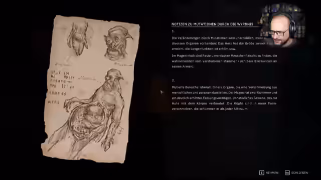 06:59:57Nach der Charaktererstellung beginnt der Streamer das Spiel und stellt fest, dass er anfangs ohne Skills startet, ähnlich wie in Dark Souls. Er erkundet das Inventarsystem, das aus verschiedenen Ausrüstungslots besteht, und findet heraus, dass er an einer Krankheit namens 'Roter Tod' leidet. Das Spiel bietet auch ein Bestiarium und ein Journal zur Erzählung der Geschichte.