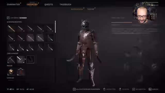 08:35:29Der Spieler kämpft gegen verschiedene Gegner, darunter untote Gestalten und kranke Menschen. Die Kampfmechanik wird als angenehm beschrieben, mit einem hohen Fenster zum Parieren. Der Spieler findet neue Waffen und Rüstungen, darunter einen Bogen und einen Dornenhelm, der Schaden auf den Angreifer zurückwirft. Die Attribute des Spielers können durch Punkte verteilt werden, um verschiedene Fertigkeiten zu verbessern. Die Welt wird als groß und voller Geheimnisse beschrieben.