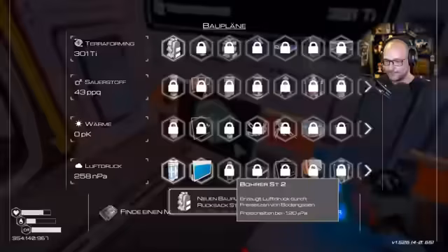 02:00:40Nachdem die grundlegende Ausrüstung geschaffen wurde, richtet der Streamer seine erste Basis ein und beginnt mit dem Bau von Anlagen zur Ressourcengewinnung. Er stellt Windkraftanlagen auf, die ohne Kabelverlegung über die gesamte Karte Strom erzeugen, und bohrt mit einem Tiefenbohrer nach Bodengasen, um den Luftdruck zu erhöhen. Der Terraforming-Index beginnt langsam zu steigen. Der Streamer zeigt den Fortschritt auf einem Bildschirm und erklärt, wie bestimmte Meilensteine, wie ein neuer Rucksack, freigeschaltet werden, sobald der Index bestimmte Werte erreicht.