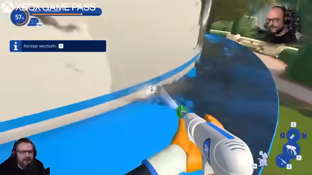02:24:00Nach technischen Vorbereitungen starten sie Powerwash Simulator 2 im Koop-Modus. Sie diskutieren die Verbindung per Raumcode und laden sich gegenseitig ein. Das Spiel ist Teil des Xbox Game Pass, und sie planen, es gemeinsam zu spielen. Dabei entstehen lustige Momente, während sie die Mechaniken des Putz-Simulators erkunden. Sie loben das befriedigende Gameplay und die Möglichkeit, gemeinsam Aufgaben zu erledigen. Die Interaktion zeigt ihre gute Dynamik und die Freude an der Kooperation, während sie die Spielwelt reinigen.