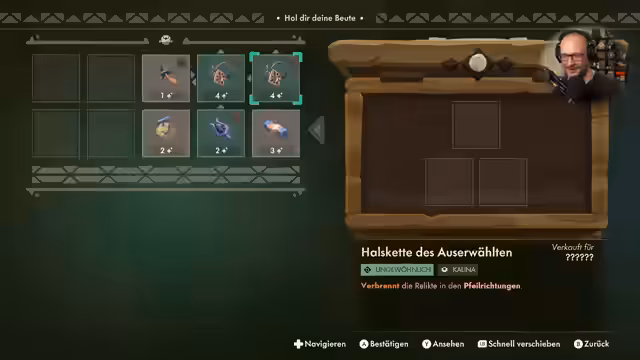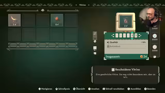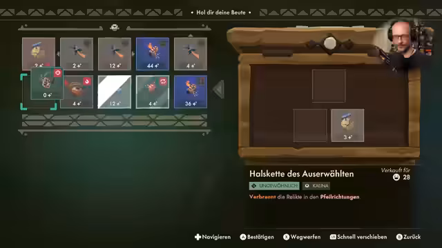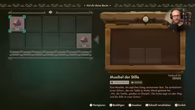 05:40:08Ein quicklebendiger Händler namens Sliver bietet Rucksackverbesserungen an. Er warnt davor, dass eine größere Sammlung auch mehr Beute für andere bedeutet, falls man versagt. Ein Rucksack-Upgrade kostet 4000 Gold. Die Möglichkeit, in den Händler zu investieren, wird als fast nett empfunden. Anschließend wird der Verkauf von Gegenständen vorbereitet, wobei der teuerste Gegenstand, die ungeborene Saat, für 1840 Gold angeboten wird, mit der Option, den Preis auf 2760 anzupassen. Weitere Gegenstände wie ein gewöhnlicher Gegenstand mit 36 Qualität für 930 Gold und ein ungewöhnlicher Gegenstand für 1008 Gold werden ebenfalls zum Verkauf angeboten. Die Preise können flexibel angepasst werden, was als Vorteil des Systems gesehen wird. Es wird auch darauf geachtet, dass die Kamera keine wichtigen Preiskategorien verdeckt, obwohl der Streamer die Preise ohnehin vorliest.