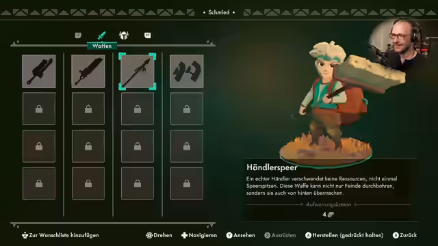 04:24:20Die Konzentration verlagert sich vom Handel auf das Ausrüsten des Charakters für zukünftige Abenteuer. Beim Schmied Andre können neue Waffen hergestellt werden, wofür spezifische Materialien wie Sonnenschlingersamen benötigt werden. Der Streamer entscheidet sich für Panzerhandschuhe, die schnell sind und einen Berserker-Modus aktivieren können. Diese Entscheidung basiert auf der bevorzugten Spielweise, die an Dual Blades aus Monster Hunter erinnert, und bereitet den Charakter für die anstehenden Kämpfe in den Dungeons vor.