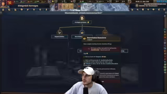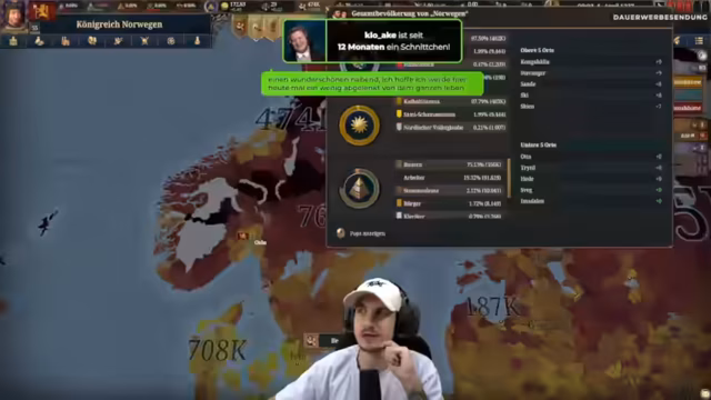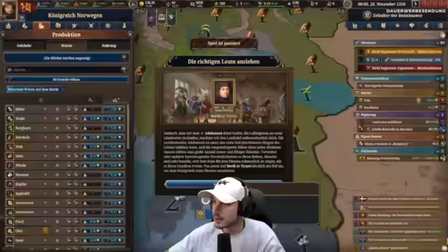 04:30:48Der Streamer stellt Europa Universalis 4 als einsteigerfreundliches Spiel vor, bei dem vieles automatisiert werden kann. Er beginnt mit dem Aufbau seines Königreichs Norwegen, konzentriert sich auf die Produktion von Wolle und den Bau von Juwelierwerkstätten. Die Versorgung der Bevölkerung in Oslo wird kritisch, da alle Bauern verbraucht wurden, was den weiteren Ausbau der Stadt unmöglich macht. Trotzdem werden ein Skriptorium und ein Königshof zur Steigerung der Kronenmacht gebaut.