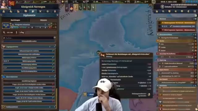 01:24:25Um den Einstieg für Neulinge zu erleichtern, nutzt der Streamer die umfangreichen Automatisierungsfunktionen des Spiels. Er automatisiert die Wirtschaft, die Handelshäfen und die Forschung, um sich auf die strategischen Entscheidungen konzentrieren zu können. Bei der Forschung priorisiert er kulturelle und gesellschaftliche Technologien, um sein Königreich langfristig zu stärken. Parallel dazu nutzt er die Diplomatie-Optionen, um Beziehungen zu anderen Nationen wie Böhmen zu verbessern und Gefallen zu erwirken. Dies dient der Absicherung gegenüber potenziellen Feinden wie Dänemark oder Schottland und zielt darauf ab, Verbündete zu finden, die bei einem Angriff als Rückendeckung dienen.