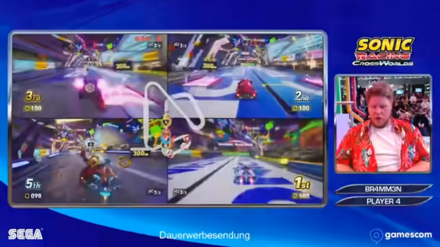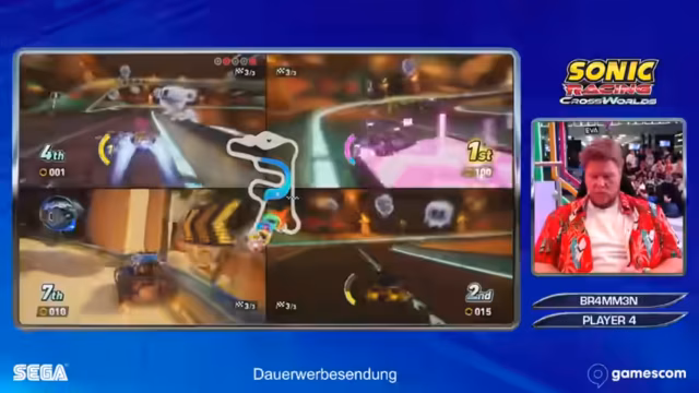 In einem Rennspiel mit Sonic-Charakteren wurde ein Grand-Prix-Modus gespielt. Die Spieler traten auf verschiedenen Strecken gegeneinander an. Nach mehreren Runden wurde ein Gesamtsieger ermittelt. Das Spiel erscheint am 25. September.