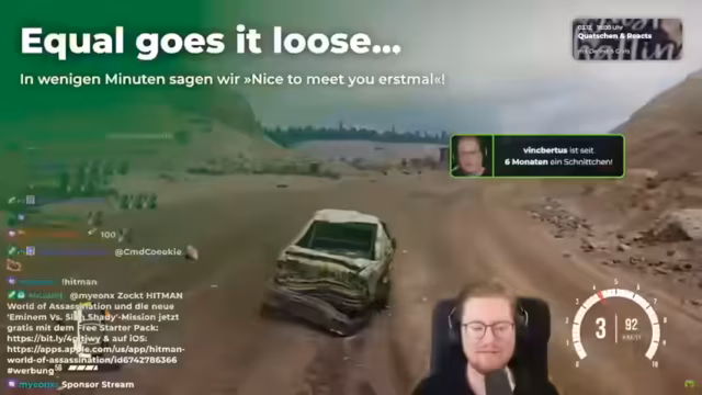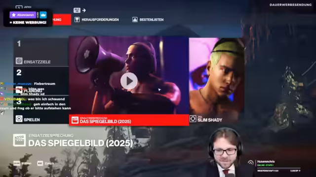 00:00:00Der Stream beginnt mit dem traditionellen Begrüßungsroutine von PietSmiet. Nachdem der Streamer willkommen heißt und über 100 neue Subs verkündet, stellt er das heutige Spiel vor: Hitman World of Assassination. Der Fokus liegt auf der zeitlich begrenzten VIP-Mission 'Eminem vs. Slim Shady', die bis zum 31. Dezember verfügbar ist. Er erläutert die Spielmechanik: Man kann die Mission kostenlos spielen, scheitert man jedoch, gibt es eine 30-minütige Cooldown-Zeit oder die Option, die Mission für 4,99 € zu kaufen.