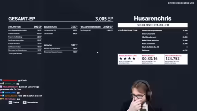 01:13:14Nach dem überraschenden Ende der Story-Mission beendet der Streamer den Versuch. Das System meldet den erfolgreichen Abschluss des Ziels 'Schwer zu fassendes Ziel'. Der Streamer erhält eine Punktzahl von 2.000 DP und landet im globalen Ranking auf Platz 124.752. Er analysiert die Leistung: Es gab Strafpunkte, weil er zweimal gesehen wurde, aber keine Punktabzüge für das Nicht-Eliminieren des Zieles. Er ist mit dem Ergebnis zufrieden und denkt über eine Wiederholung nach, um alternative Lösungswege zu finden.