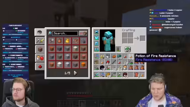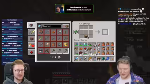 04:03:53Nachdem ein Wald gefunden wurde, wird die Beschaffung von Kupfer zum Schmelzen priorisiert. Die verbleibende Zeit von knapp vier Stunden wird als ausreichend für weitere Fortschritte angesehen. Die Vorbereitungen für das morgige Event "Minecraft Attack" um 18 Uhr mit dem gesamten Team PietSmiet werden getroffen. Die eigene Area auf der Map wurde bereits markiert, um eine Bebauung durch andere Spieler zu verhindern. Es wird die benötigte Menge an Kupfer für die Notenblöcke diskutiert, wobei zehn Einheiten als ausreichend erachtet werden. Die eigene Minibase wird wiederhergestellt, und es werden weitere Materialien wie Leder und Steak gesammelt. Die Empfehlung des Chats, auf Diamantschuhe zu wechseln, wird angenommen, um die Überlebenschancen zu erhöhen. Die Beschaffung von Cobblestone für zwei Öfen wird als nächster Schritt geplant.