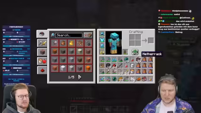 02:28:02Der Streamer sucht weiterhin nach einem Hoglin, um ihn zu füttern und Punkte zu sammeln. Er überlegt, ob das Halten eines Busches in der Hand für Silk Touch ebenfalls Punkte bringt. Plötzlich kündigt sich Peter an, der sich entschuldigt, zu spät zu sein. Der Streamer schaltet seine Kamera für Peter ein und bestätigt, dass der Livestream läuft. Die Suche nach dem Hoglin wird fortgesetzt, um anschließend die Netherdecke zu erklimmen.
