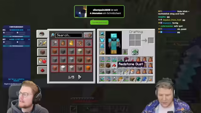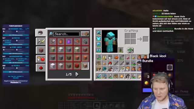 01:49:25Der Streamer entscheidet sich, zuerst die Seelenlaterne und den Tageslichtsensor zu bauen, da diese weniger Aufwand erfordern. Er sammelt die benötigten Materialien wie Kohle und Soul Sand und craftet die Seelenlaterne, die blau leuchtet. Anschließend baut er eine Redstone-Lampe und einen Tageslichtsensor, um die Aufgabe zu erfüllen, die Lampe nachts zum Leuchten zu bringen. Dies bringt ihm 10 Punkte und Belohnungen wie Grindstone und Lapislazuli ein. Er überlegt, ob er noch Feuerwerk herstellen soll, stellt aber fest, dass ihm Schießpulver fehlt.