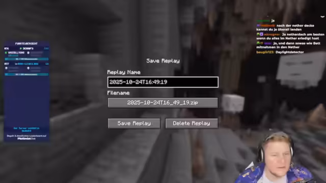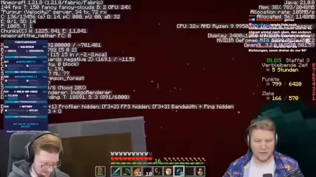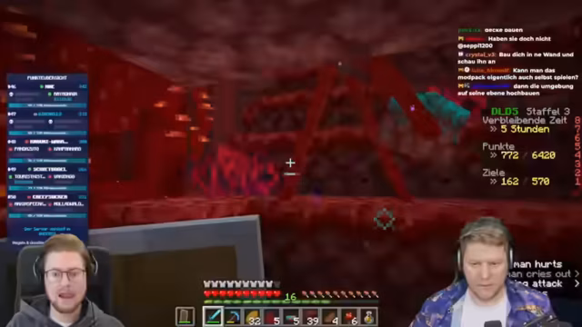 02:40:39Die Spieler erreichen die Netherdecke bei der Koordinate 125, wie im Chat und auf der DLDS-Seite bestätigt. Sie bauen sich hoch und bereiten sich darauf vor, eine Enderperle 100 Meter weit zu werfen. Dafür müssen sie sich weitere 60 Blöcke hochbauen und die Perle in zwei Richtungen werfen, um die Aufgabe zu erfüllen. Nach dem erfolgreichen Wurf der Enderperlen, der 800 Punkte einbringt, steht die nächste Herausforderung an: 22 Blöcke ohne Rüstung zu fallen, ohne zu springen, nur durch Laufen. Dies wird als eine der schwierigsten und nervenaufreibendsten Aufgaben empfunden.