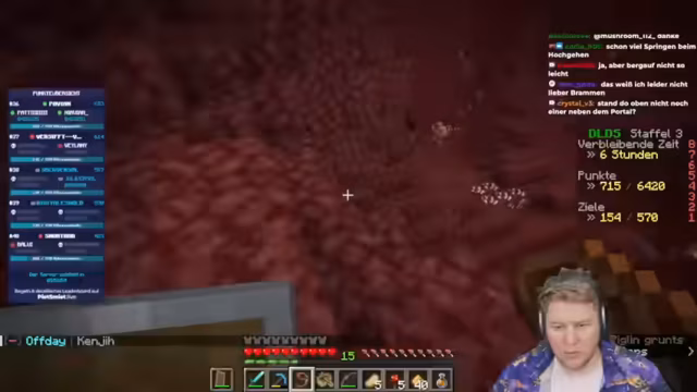 00:06:30Der Streamer analysiert die aktuelle Rangliste von DLDS und stellt fest, dass die Zwillinge, die er gestern interviewt hatte, von Platz 6 auf Platz 7 abgerutscht sind, aber immer noch in den Top 10 sind. Er bewundert ihre Leistung von 1450 Punkten, obwohl sie nicht viel im Nether waren. Er selbst hat erst die Halbzeit erreicht und knapp über 700 Punkte, müsste seine Punkte also verdoppeln, um mit den Zwillingen gleichzuziehen. Sein persönliches Ziel ist es, das Team TV Chili mit Lilly und Cardi zu übertreffen, die 1000 Punkte haben. Er erwähnt, dass Christian und Jay sogar schlechter sind als diese beiden. Obwohl er seine eigene Platzierung bereits akzeptiert hat, da er nicht so lange gespielt hat, möchte er dennoch versuchen, seine Punkte zu verbessern. Er plant, in seinen verbleibenden 5 Stunden und 44 Minuten etwa 300 Punkte zu erreichen, indem er Nether-Aufgaben erledigt und Dinge wie Notenblöcke und TNT nutzt.