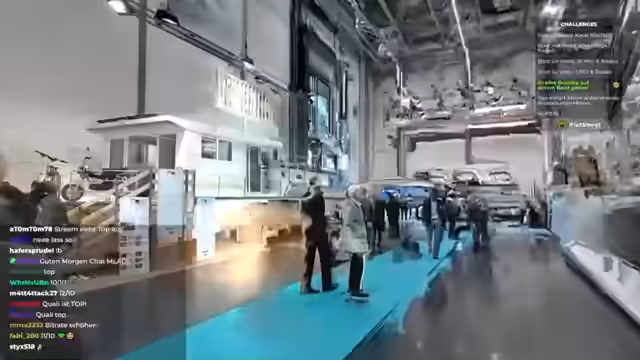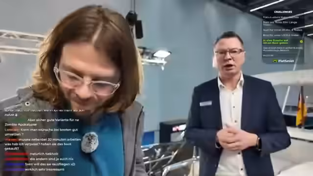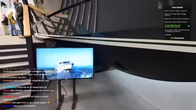 00:48:00Nachdem die Challenge 'Betrete eine Dusche auf einem Boot' erfolgreich absolviert wurde, haben die Streamer einen ersten großen Erfolg auf der Messe verzeichnet. Sie diskutieren die Fortsetzung ihrer Tour und erkunden weiter die Messehallen. Dabei beobachten sie andere Aussteller, wie etwa einen Stand für Boote mit Grill und Plattform, und planen, weitere Exponate zu besichtigen, sobald sie aus der Warteschlange für die Führung bei Schäfer freikommen.