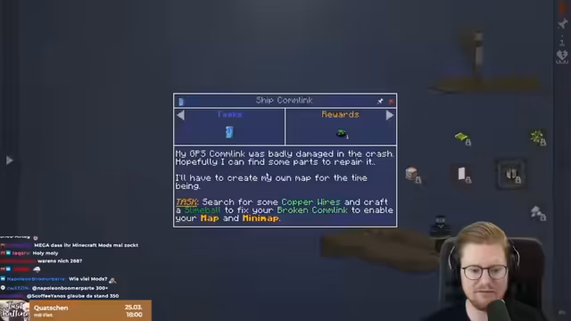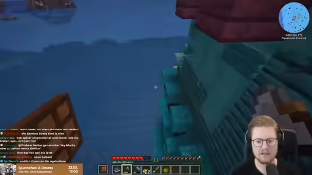 01:17:17Es beginnt ein neues Minecraft-Abenteuer in Oceanblock 2 mit Christian, Ram und Peter. Die Spieler finden sich auf dem Ozean wieder, ohne zu wissen, was vor sich geht. Christians Skin als Hund (Odi aus Garfield) wird kommentiert. Es handelt sich um das erste Mal, dass die Gruppe ein so großes Modpack ausprobiert, als Vorbereitung auf das nächste große Streamprojekt Elements 3. Das Ziel ist es, das Ship-Combling zu reparieren. Das Spiel beginnt mit dem Abarbeiten von Quests, die im Buch gefunden werden können. Es gibt über 300 Mods im Spiel, aber eine Main-Questline namens Getting Started hilft beim Einstieg. Die Spieler können sich Rewards für abgeschlossene Quests geben lassen, darunter auch Essen. Es wird festgestellt, dass die Map zu Beginn leer ist und erst erstellt werden muss. Das Spiel erinnert an Subnautica, da man unter Wasser eine Klappe hat, durch die man ins Wasser gelangen kann. Es werden erste Materialien wie Holz und Sea Pickles gefunden und in einem Fass gelagert.