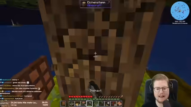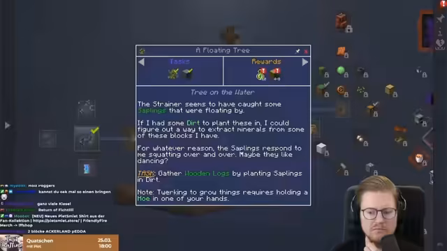 01:06:30Nach der Diskussion der Minecraft-Updates wechseln die Streamer zum Gameplay von Oceanblock 2, einem riesigen Modpack. Das Ziel ist es, auf einer gefluteten Welt überzleben. Die Spieler müssen zunächst mit den gesammelten Holzschlägeln und Werkbänken eine Basis bauen und sich orientieren, während sie die ersten Quests abschließen, um in die Welt des Modpacks einzutauchen.