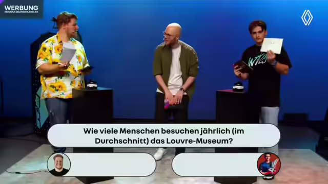 04:45:57Nach der ersten Kategorie folgt ein Bilder-Rätsel, bei dem es darum geht, Orte oder Objekte auf unscharfen Bildern zu erkennen, die allmählich schärfer werden. Wer zuerst buzzert und richtig antwortet, erhält einen Punkt. Bei einer falschen Antwort ist die Runde für den betreffenden Spieler beendet. Gesucht wird zunächst ein Gebäude, und Marcel buzzert mit dem Eiffelturm, was jedoch falsch ist. Brammen antwortet mit Notre Dame und liegt richtig. Im nächsten Durchgang wird ein Ort gesucht, und Brammen erkennt Monaco. Es steht nun eins zu eins. In Runde drei sollen Personen erraten werden. Brammen löst das Rätsel und nennt Asterix und Obelix. Es steht 2 zu 1 für Brammen. Es folgt eine weitere Runde, in der entweder ein Objekt oder ein Ort erkannt werden soll. Marcel und Brammen liegen beide mit ihren Antworten falsch. Gesucht war eine Ariane 5-Rakete. In Runde 5 wird wieder ein Objekt gesucht. Brammen antwortet mit Eiffelturm und liegt richtig. Es steht 2 zu 2 und es kommt zum Stechen. Gesucht wird ein Ort. Brammen antwortet mit Sacré-Cœur und liegt falsch. Marcel antwortet mit Paul Ricard und liegt richtig. Marcel gewinnt diese Kategorie. Es steht 1 zu 1. In der dritten Kategorie folgen Schätzfragen. Die erste Frage lautet, wie viele Menschen jährlich das Louvre Museum besuchen. Marcel schätzt 10 Millionen und liegt damit richtig. Die nächste Frage ist, in welchem Jahr der Renault 4 erstmals vorgestellt wurde. Brammen schätzt 1964 und liegt mit seiner Antwort näher an der richtigen Antwort (1961) als Marcel. Es steht eins zu eins. In Runde 3 wird geschätzt, wie viele Kilometer die Fahrer bei der Tour de France 2025 zurücklegen werden. Brammen liegt mit seiner Schätzung näher an der richtigen Antwort. Es steht 2 zu 1 für Brammen. Es folgt die Frage nach dem Preisgeld beim französischen Tennisturnier Roland Garros. Marcel liegt mit seiner Schätzung näher an der richtigen Antwort. Es steht 2 zu 2. In der letzten Frage geht es um das Jahr, in dem die französische Revolution begann. Marcel liegt mit seiner Antwort näher an der richtigen Antwort. Marcel gewinnt diese Kategorie.