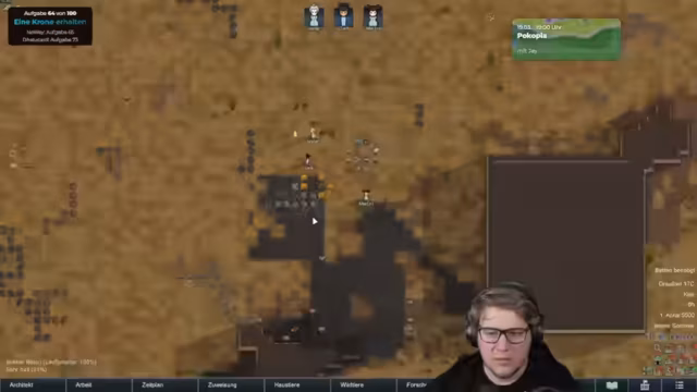 02:57:45Nach langer Suche und mit Hilfe des Chats wird in RimWorld ein Händler namens Humphrey gefunden und getötet, um die Aufgabe zu erfüllen. Anschließend wird die nächste Aufgabe 'Reifen zerschießen' diskutiert. PUBG wird als ungeeignet befunden, da man erst eine Waffe finden muss. Stattdessen wird als schnelleres Terraria vorgeschlagen. Gleichzeitig wird die allgemeine Struktur des Formats kritisiert, da die enorme Ladezeit vieler Spiele den Fortschritt stark verlangsamt.