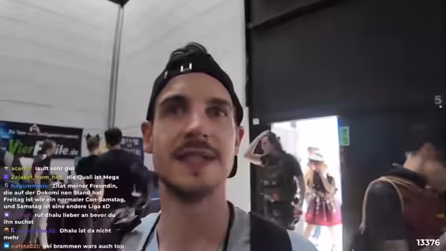 02:33:55Sebastian begrüßt die Zuschauer auf der DOKOMI in Düsseldorf, einer Messe für Anime- und Manga-Fans. Nach einer kurzen technischen Vorbereitung, bei der das Kabel verlängert werden muss, geht es hinein in die Hallen. Sebastian ist als alleiniger Streamer unterwegs und plant, durch die Messe zu ziehen, um Cosplayer zu bewundern und mit Fans und Künstlern zu interagieren. Er beschreibt das große Gelände und die verschiedenen thematischen Bereiche wie Gaming und Crafting.