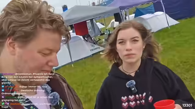 02:01:02Rada ist kurz zum Einkaufen weg, während auf dem Zeltplatz bereits eine lockere, gemeinschaftliche Stimmung herrscht. Es wird über das bevorstehende Grillen gesprochen und die Freude über die Möglichkeit, direkt mit den Fans interagieren zu können, ist deutlich spürbar. Die Organisation und die Infrastruktur, wie etwa die angelegten Wege durch den matschigen Boden, werden gelobt, was das Besucherle显著 verbessert. Die Sicherheitsvorkehrungen, wie eine 24-7-Notfall-Eingreiftruppe, werden als sehr wichtig empfunden.