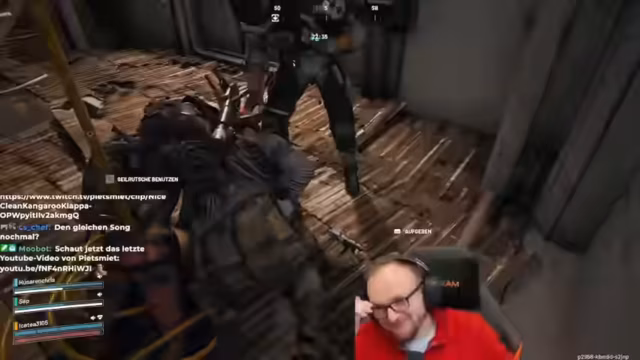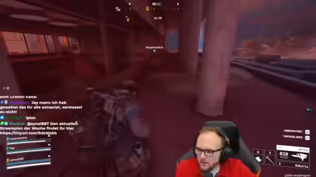 01:45:14Die Spieler tauschen Erfahrungen mit E-Tankstellen aus und diskutieren über Parkgebühren. Ein Spieler muss einen 'Ausrichtpunkt' auf einem Berg erreichen, was sie zu einem Gebiet mit vielen roten Gebäuden und Spawns führt. Sie sind spät in der Runde und werden von einem 'Spitzel' gesichtet. Ein Spieler muss einen Teil eines 'Spitzelscanners' für eine Quest mitnehmen. Sie bewundern die Stimmung des Sonnenuntergangs, werden aber von einem 'Rollball' überrascht, den sie für einen Gegner halten. Ein Spieler wird beschossen und fällt vom Dach, während er versucht, eine Quest zu erledigen. Sie werden von mehreren Gegnern und 'Rollbällen' angegriffen. Ein Spieler schließt seine Quest ab, während die anderen unter Beschuss geraten. Sie versuchen, sich zu sammeln, während 'Kameras' und 'Sucher' sie angreifen. Sie müssen sich zurückziehen, da immer mehr 'Viecher' auftauchen. Ein 'Flammenwerfer-Dude' erscheint, und die Gruppe verliert die Gegner aus den Augen. Sie entdecken eine 'fette Krabbe' und beschließen, sie zu umgehen, da sie keine Fernkampfwaffen oder Munition mehr haben. Sie sind froh, dass die 'Arcs' die Gegner ablenken.