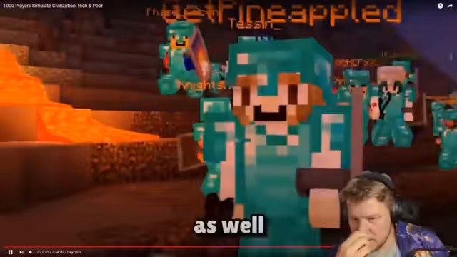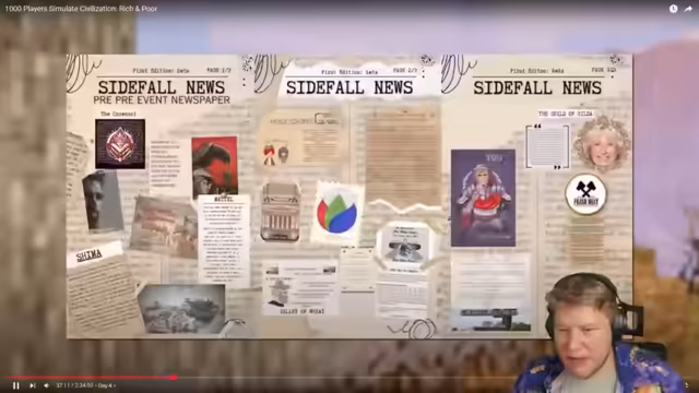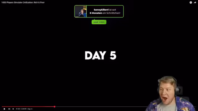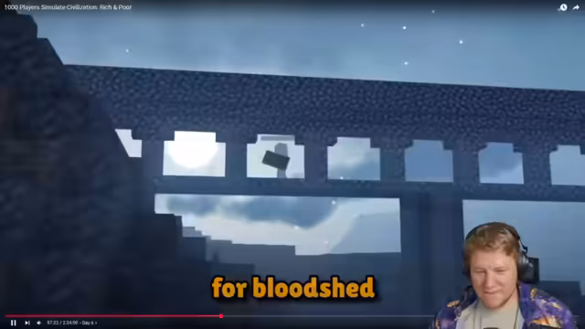 00:40:09Der Streamer begrüßt die Zuschauer zu einem "Megaspecial", bei dem er sich mit Freunden das angeblich beste YouTube-Video 2025 namens "1000 Player Simulator Civilization Rich & Poor" ansieht. Das Video ist von Isch und dauert 2 Stunden 34 Minuten. Viele Leute haben dem Streamer geschrieben, dass er sich das Video unbedingt ansehen soll, weshalb er sich nun die Zeit dafür nimmt. Er fragt sich, ob alle Teilnehmer im Video Streamer sind. Das Video beginnt mit der zufälligen Aufteilung der Spieler auf zwei Inseln, von denen eine eine karge Einöde ist. Der Streamer kommentiert die unterschiedlichen Lebensbedingungen auf den Inseln und fragt sich, ob die Spieler bereits voneinander wissen. Er äußert die Vermutung, dass jemand auf die Idee kommen könnte, den großen Baum auf der ressourcenreichen Insel anzuzünden.