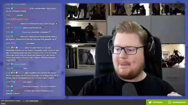 00:00:04Der Stream beginnt mit einer Begrüßung der Zuschauer und einer kurzen Einführung. Es wird über vergangene und zukünftige Aufnahmen gesprochen, darunter CSGO und Wreckfest. Die Gruppe plant ein internes Mini-Turnier in Escape from Tarkov und eine Aufnahme des PietCast. Es gab anfängliche Schwierigkeiten mit COD, die jedoch behoben wurden. Die Moderatoren erhalten Admin-Rechte, um Passwörter zu verwalten und Störenfriede zu entfernen. Ein kurzer Exkurs über die Abkürzung von Fußballvereinen sorgt für einige Lacher. Die Community wird eingeladen, bei Wreckfest mitzuspielen, wobei die Streamer betonen, wie wichtig es ist, die Passwörter nicht an unbefugte weiterzugeben. Es wird überlegt, was im 20-Stunden-Stream am Freitag gezeigt wird, einschließlich der Möglichkeit, Rimworld mit einem neuen DLC zu spielen, das die Option bietet, Kinder zu bekommen.
