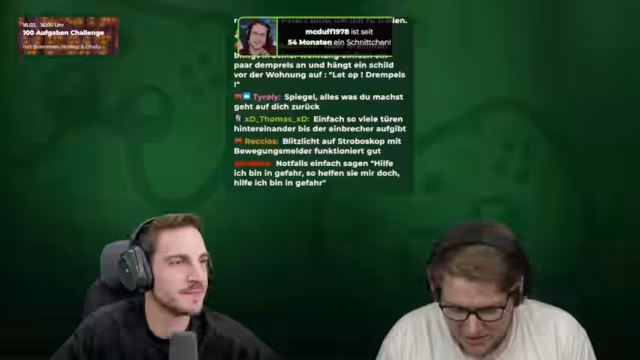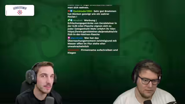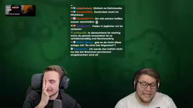 00:55:26Im Stream wird eine heftige Debatte über das Recht auf Notwehr bei einem Einbruch geführt. Bram vertritt die strikte Ansicht, dass er sich mit aller Konsequenz gegen einen Eindringling verteidigen dürfe, um die unmittelbare Bedrohung für sich und sein Hab und Gut zu beseitigen. Dabei beschreibt er potenzielle Verteidigungsmethoden, von einem Schlag mit einer Bratpfanne bis hin zu drastischeren Maßnahmen wie dem Einsatz einer Nagelpistole, um den Eindringling kampfunfähig zu machen, solange dies im Verhältnis zur angenommenen Gefahr stehe.