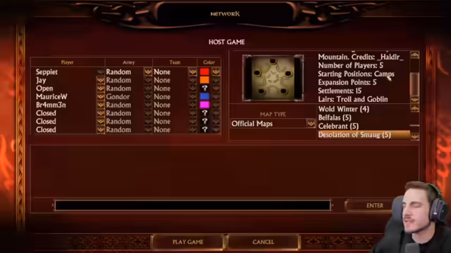 02:08:53Alle vier Spieler – Brammen, Maurice, Mara und Sep – sind endlich erfolgreich im Spiel. Es wird beschlossen, eine zufällige 5er-Karte im Free-for-All-Modus zu spielen. Brammen, Maurice und Mara haben wenig Erfahrung mit den 'bösen' Völkern wie Isengard oder Mordor, was die Ausgangslage dynamisch macht. Brammen übernimmt die Moderation und begrüßt die 'werten Gefährten' zum Spiel. Brammen selbst zieft zufällig das Volk Rohan, während die Völker der anderen Spieler zunächst unklar bleiben.