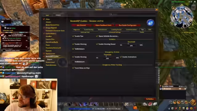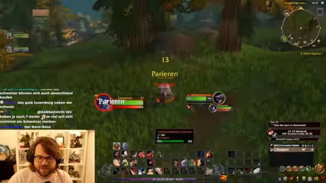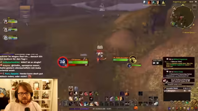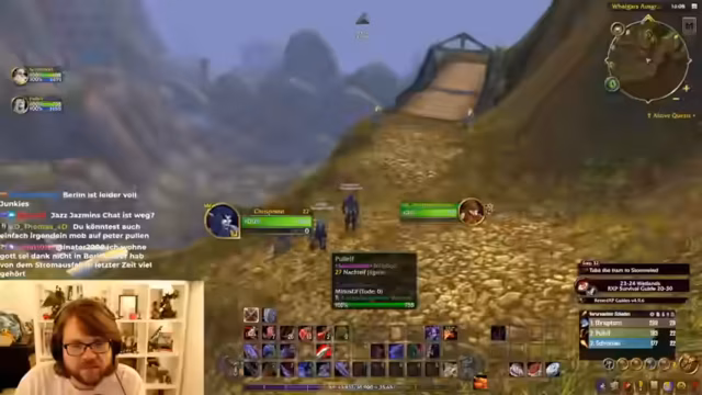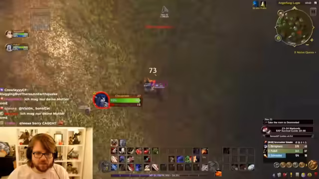 01:01:03Der Stream beginnt mit der Beschreibung einer Quest, der Streamer kann sie jedoch nicht abschließen, was zu Frust führt. Parallel dazu findet eine lockere Interaktion mit dem Chat statt, in dem das Alter der Zuschauer geschätzt wird. Die Zuschauer schätzen das Alter des Streamers auf Mitte 20 bis Anfang 30, was er selbst bestätigt, aber auch als ungenau empfindet. Es gibt zudem technische Ablenkungen und eine Rückkehr zur Quest, wobei ein Addon namens RestedXP als potenziell problematisch für den Questfortschritt identifiziert wird.
