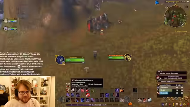 06:01:51Die finale Gruppe ist komplett und betritt den Dungeon 'Burg Schattenfang'. Der Streamer geht die Taktik für den ersten Boss durch, insbesondere auf die Notwendigkeit, bestimmten Fähigkeiten wie Schattenblitze auszuweichen. Während des Dungeons gibt es einen kritischen Moment, als Peter, der niedrigste Level, versehentlich einen starken Mob zieht und in Gefahr gerät. Die Gruppe arbeitet jedoch gut zusammen und rettet ihn, um den Dungeon erfolgreich abzuschließen.