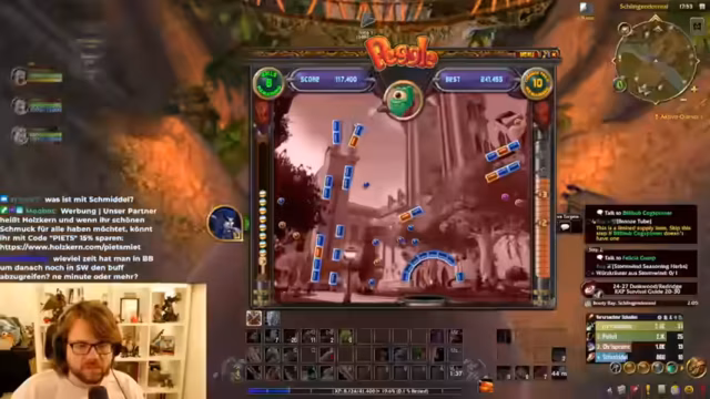00:29:35Ein Gildenmitglied tritt im Chat auf und möchte den Streamern beim Leveling in den 'Sumpfland' Wetlands begleiten. Die Streamer willkommen den Gast und planen die Route mit Hilfe von RestedXP. Parallel dazu kommt es zu organisatorischen Problemen im Gildenalltag, etwa dass Mitglieder ihre Bankinventare voll haben oder Gildensteuern nicht bezahlt wurden. Auch private Themen wie der bevorstehende Umzug in ein neues Büro und anstehende Gewinnspiele werden angesprochen.