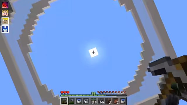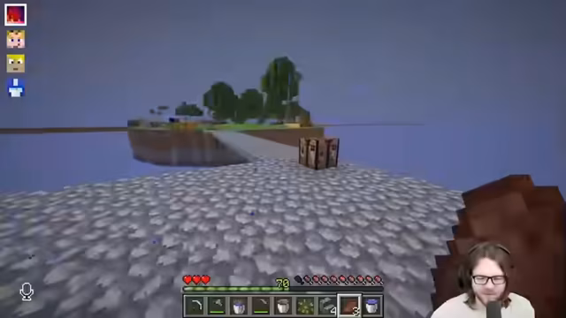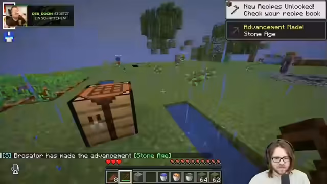 00:41:43Die Streamer begeben sich in ihre Skyblock-Welt, die von anderen Spielern geteilt wird. Sie stellen schnell fest, dass der Tod im Spiel zwar zu erheblichen Level-Verlusten führt, aber keine Gegenstände kostet. Dies ermutigt zu risikoreichen Experimenten, wie das Versenken anderer Spieler in Lava. Die unmittelbare erste Aufgabe ist der Bau eines Steingenerators, um die geforderten 100 Steine für den ersten Dorfbewohner zu beschaffen und das Spiel voranzutreiben.