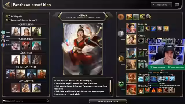 00:13:45Das Spiel Age of Mythology startet mit den neuen chinesischen Göttern. Die Teilnehmer wählen verschiedene Unterherrscher und testen deren Fähigkeiten. Es wird festgestellt, dass die Chinesen einige starke Mechaniken haben. Die Atlanta waren auch nicht von Anfang an dabei. Die Teilnehmer diskutieren die Atlanta und die Chinesen als neue Völker mit komplexeren Mechaniken. Es wird King of the Hill gespielt. Der Guafu, ein Riesentyp, wird als Ressourcensammler eingesetzt, der aber teurer ist. Die Bedeutung der Gebäudeanordnung für die Gunstgewinnung wird erklärt. Jeder Spieler hat einen eigenen Bonus, der durch Gunst freigeschaltet wird. Die Teilnehmer haben sich ressourcenmäßig verkalkuliert. Es wird festgestellt, dass ein Gott einen Bonus auf Feldern hat. First Blood wird erwähnt und Maurice als Nachbar identifiziert. Die Götter haben unterschiedliche Boni, die es zu entdecken gilt. Der schnelle Bau von Gebäuden wird kommentiert. Die Ressourcengebäude zählen doppelt, was als angenehm empfunden wird. Ein gemeinsamer Chat wird aufgrund des FFA-Charakters als problematisch angesehen. Die Spieler sind überfordert mit den neuen Mechaniken und Einheiten.