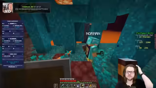 01:52:00Die Spieler erkunden eine tief liegende Höhle in der Hoffnung, Diamanten zu finden. Eine Fullbright-Mod sorgt für gute Sicht, auch wenn sie das Gameplay etwas erleichtert. Die Atmosphäre angespannt, da sie der gefürchteten Bastion im Nether noch ausweichen. Sie sammeln Amethyst und planen, eine Dia-Axt und eine Rüstung herzustellen. Ein Inventar-Bug führt bei anderen Spielern zu Problemen.