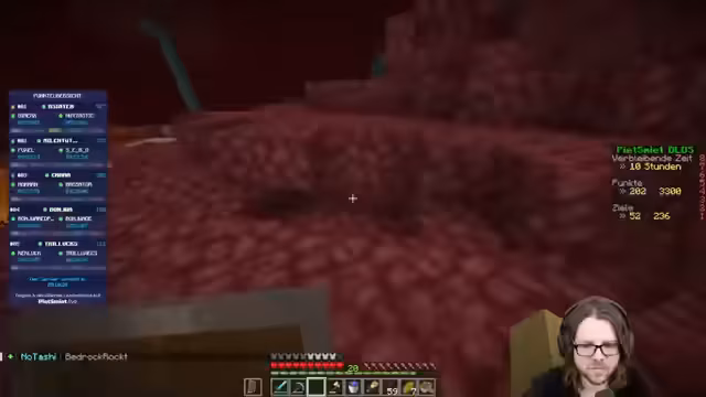 03:04:06Nachdem die notwendige Ausrüstung fertiggestellt ist, betreten die Teilnehmer den Nether und notieren sich die Koordinaten des Portals (340, -80, 1220) für den Rückweg. Die Orientierung gestaltet sich schwierig, da die Sicht durch Lava und das Biom eingeschränkt ist. Während der Suche nach einer Bastion werden verschiedene Biome durchquert, darunter ein Soul Sand Valley. Im Chat wird zudem bekannt, dass weitere Teams wie die Zwillinge und Synthica ausgeschieden sind. Die Teilnehmer sammeln weiterhin Enderperlen und erkunden die Umgebung systematisch nach einer Netherfestung.