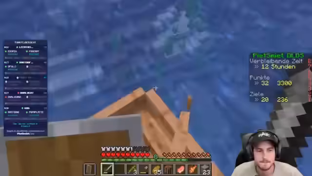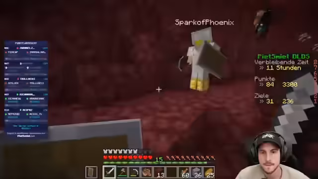 07:49:38In der letzten Phase des Streams gelingt es dem Streamer, eine Festung zu finden und die Blaze-Rods zu sammeln, die er für sein Ziel benötigt. Nach einigen Herausforderungen, dar dem Kampf gegen Witherskelette und Blazes, erreicht er das Ziel und sammelt alle acht benötigten Gegenstände. Mit über 200 Punkten und Platz 9 in der Rangliste fühlt er sich erfolgreich und zeigt Erleichterung über das Überstehen des anspruchsvollen Teils der Mission. Die letzten Minuten nutzt er, um Ressourcen zu handeln und vorbereitet sich auf den Serverneustart und den nächsten Tag des Streams.