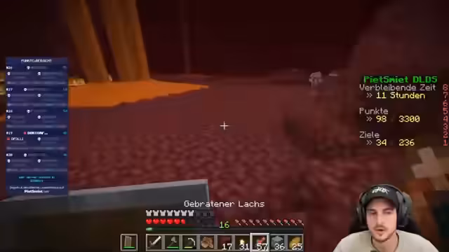 06:56:49Es wird festgestellt, dass Belohnungen für bestimmte Aktionen im Nether nicht wie erwartet ausgezahlt werden. Daniel kommt hinzu, um das Problem zu bestätigen und weiterzuleiten. Es wird überlegt, ob das Problem bekannt ist und ob andere Spieler ähnliche Erfahrungen gemacht haben. Das Team synchronisiert sich kurz und tauscht sich über die Situation aus. Ein Enderman wird entdeckt und getötet, um eine Perle zu erhalten. Es wird überlegt, ob für bestimmte Aktionen Belohnungen ausgezahlt werden sollten und der Chat wird um Hilfe gebeten, um dies zu überprüfen. Es wird über die Boot-Thematik diskutiert und wie man Dreier-Situationen mit Endermen vermeidet. Es wird beschlossen, sich auf das Farmen von Gold und das Bartern zu konzentrieren. Das Oh-Shiny-Advancement soll erneut versucht werden. Ein Enderman mit einem Crossbow wird entdeckt. Es wird eine Strategie entwickelt, um einen Piglin mit Gold zu bestechen, um Punkte zu erhalten. Es werden verschiedene Items getauscht und die Notwendigkeit von Feuerresistenz-Tränken für Festungen diskutiert. Das Team plant, Glowstone zu sammeln, um einen Respawn-Anker zu aktivieren, und Crying Obsidian zu finden.