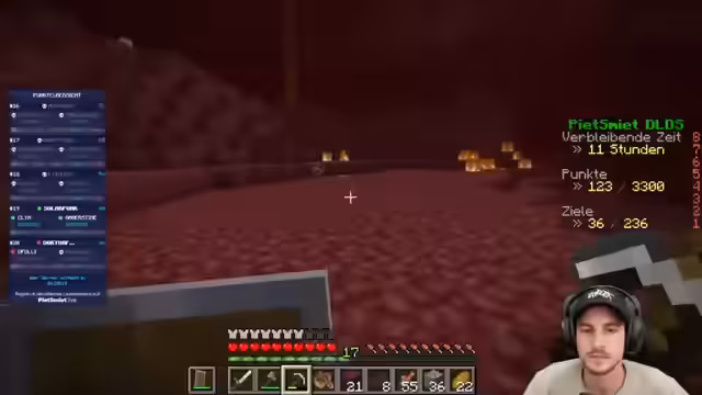 08:18:03Das Stream-Team beendet die Suche nach Obsidian im Nether. Dabei werden Verwirrungen über bereits gefundene Obsidian-Stücke und die notwendige Anzahl deutlich. Die Spieler müssen ihre Spitzhacken wechseln und achten auf Schwarzstein, der dem gesuchten Obsidian ähnlich sieht. Das Team koordiniert die Suche und stellt fest, dass noch ein einziges Obsidian-Stück fehlt, bevor sie den Nether verlassen können.