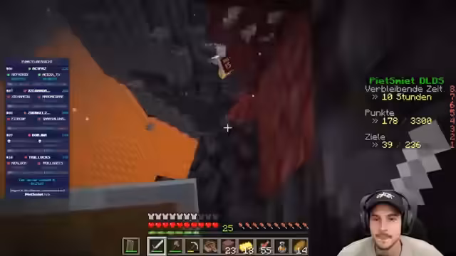 00:38:11Das Konzept von DLDS Staffel 2 wird erläutert, bei dem Zweierteams Achievements jagen müssen. Es wird diskutiert, wie viele Teams teilnehmen, wobei die Antwort 32 Teams mit 64 Streamern lautet. Es wird ein Plan für das Spiel vorgestellt, wobei der Bastion- und Festungspunkt im Nether als kritisch angesehen wird, insbesondere für Norman. Ansonsten sieht man die Situation bis zum Enderdrachen recht entspannt. Es wird betont, dass die Priorität ist, nicht zu sterben, da man sonst ausscheidet. Es wird erklärt, dass immer nur die Person ausscheidet, die stirbt, und der andere weitermachen kann. Es können quasi zweimal Punkte geholt werden, wenn beide das gleiche Achievement haben. Es wird bestätigt, dass es eine Übersicht von den Punkten auf peetsmeet.live und in den Overlays geben wird. Die Details auf der Webseite werden angezeigt, sobald das Team das erste Mal durchs Portal gegangen ist. Es wird erklärt, dass die Minecraft Achievements abgearbeitet werden und je nach Schwierigkeit Punkte geben.