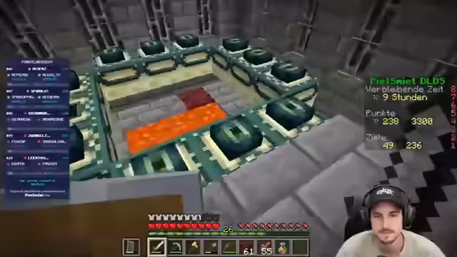 08:03:21Die Gruppe wird von Zuschauern ermutigt, eine Festung zu finden. Nach langer Suche wird endlich eine Festung entdeckt. Die Freude ist groß. Es wird besprochen, dass die Aufgabe nun darin besteht, zu den Blazes zu gelangen und diese zu besiegen, um acht Blaze Rods zu erhalten. Obsidian soll ertradet werden, um einen Ausgang zu schaffen. Es wird ein Feuerresistenz-Trank getrunken, um sich vor den Flammen zu schützen. Die erste Blaze wird gesichtet und angegriffen. Es wird darauf hingewiesen, dass die Blazes auch Nahkampfschaden verursachen. Die Gruppe erhält Punkte für das Besiegen der Blazes. Es wird ein Blaze-Spawner gefunden und die Gruppe bereitet sich darauf vor, die Blazes zu farmen. Es wird eine Strategie entwickelt, um den Spawner zu sichern und die Blazes effektiv zu bekämpfen. Die Gruppe hat bereits drei Feuerresistenz-Tränke verbraucht. Es werden Blaze Rods gesammelt und die Gruppe nähert sich dem Ziel von acht Stück. Aktuell befindet sich die Gruppe auf Platz 10. Die Gruppe spielt vorsichtig und sicher. Es werden weitere Blaze Rods gesammelt und die Gruppe erreicht Platz 8. Es wird überlegt, ob der Feuerresistenz-Trank noch benötigt wird. Die Gruppe hat sechs von acht Blaze Rods. Die Gruppe hat sieben von acht Blaze Rods. Die Gruppe hat acht Blaze Rods und ist bereit, die Festung zu verlassen.