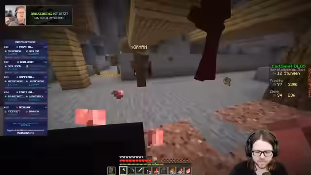 03:14:52Die Spieler setzen ihre Erkundung des Nethers fort, wobei sie sich entscheiden, ob sie sich durch den Nether graben oder einfach herumlaufen sollen. Sie einigen sich darauf, ein wenig zu graben und vorsichtig zu sein. Ein kurzzeitiger Lag wird erwähnt, und die Spieler warten, bis er vorbei ist, bevor sie weitermachen. Sie buddeln sich einen Weg und achten auf Gefahren. Ein Spieler erinnert sich daran, dass er einem Piglin Goldschuhe geben muss, um ein Advancement zu erhalten. Es kommt zu Verwirrungen bei der Durchführung des Trades, und der Spieler wird von den Piglins angegriffen. Die Spieler beschließen, das Portal mitzunehmen, um einen sicheren Rückweg zu haben. Sie diskutieren über die Notwendigkeit, eine Festung zu finden und ob sie diese überspringen sollten. Die Spieler stellen fest, dass andere Teams bereits ausgeschieden sind. Sie setzen ihre Suche fort und achten auf ihre Umgebung. Ein Spieler macht riskante Sprünge, was den anderen Spieler beunruhigt. Die Spieler suchen nach einem bestimmten Biom und stellen fest, dass sie wahrscheinlich in die falsche Richtung gelaufen sind. Es wird über die Hitze und mögliche Gefahren gesprochen.